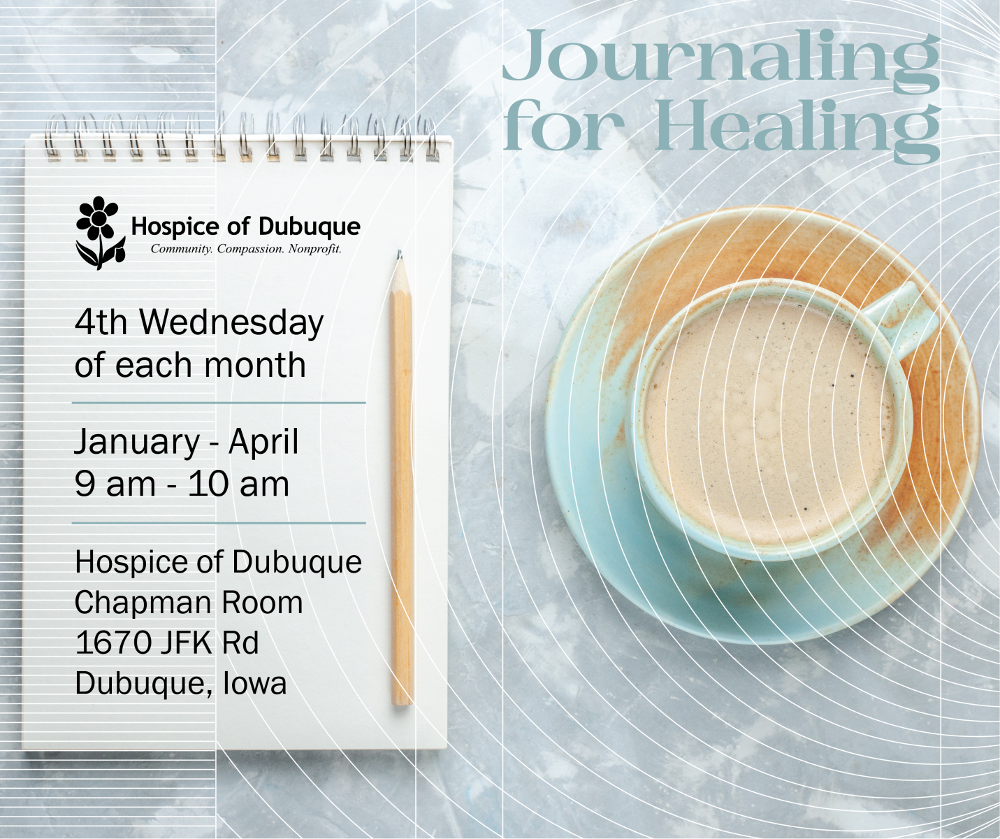 Meet in the Chapman Room located at Hospice of Dubuque, 1670 JFK Road, Dubuque, Iowa. Each participant will receive a complimentary journal, and, during each group session, different journaling prompts will be provided. Your journal reflections will remain confidential. No prior journaling or writing experience is necessary. The writing process can be an effective tool in healing, so please consider joining us for this opportunity.