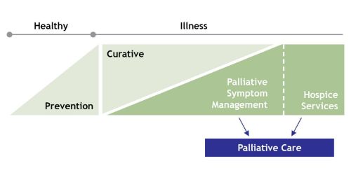 | Can be provided earlier in the disease process. Is available for patients at any age or stage of illness. Does not require a prognosis of six-months or less. | Is focused on comfort and quality of life for individuals who are no longer pursuing curative treatments and offers support to patients and families. |